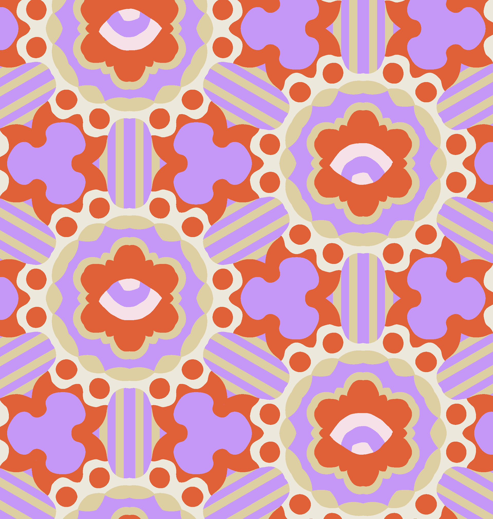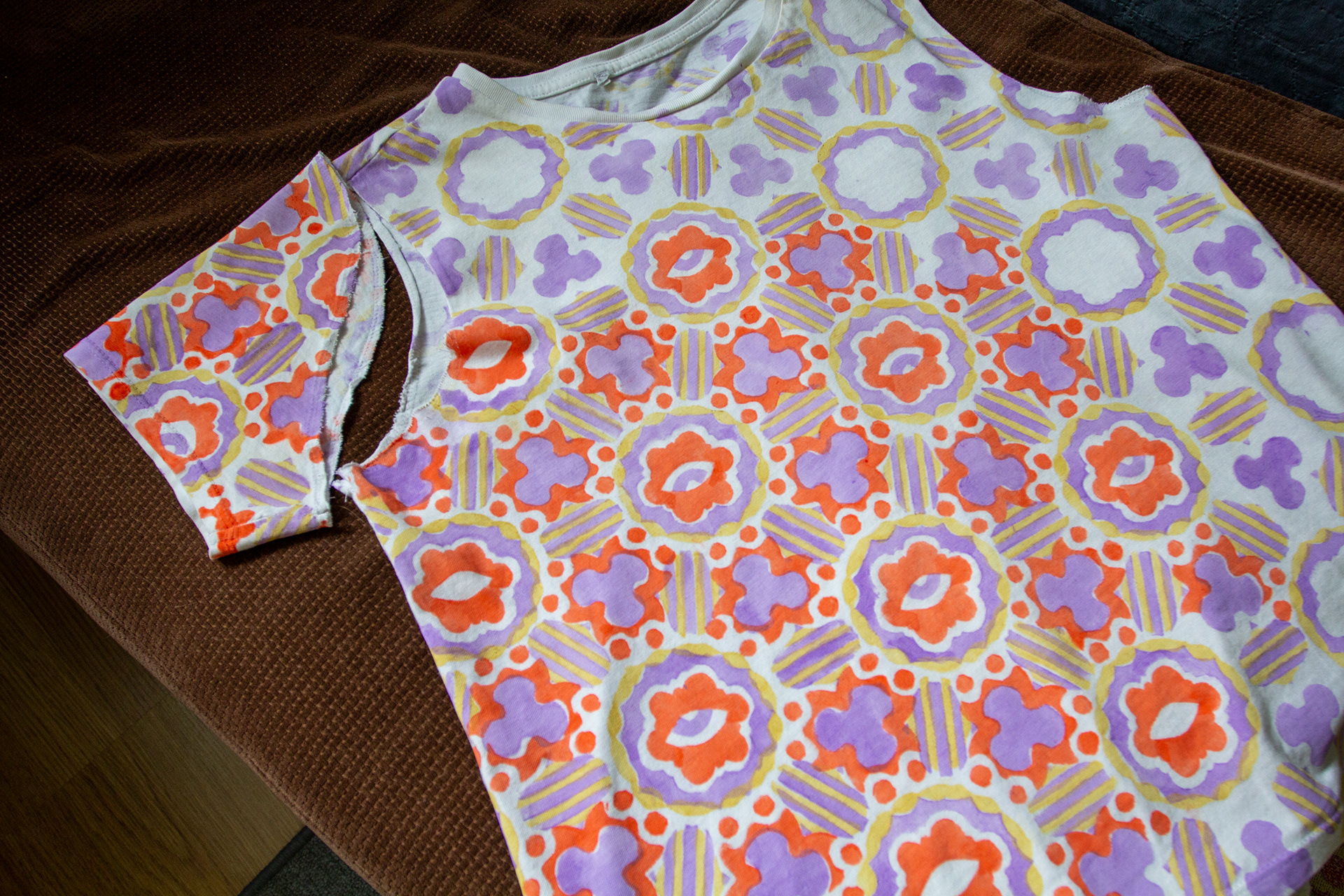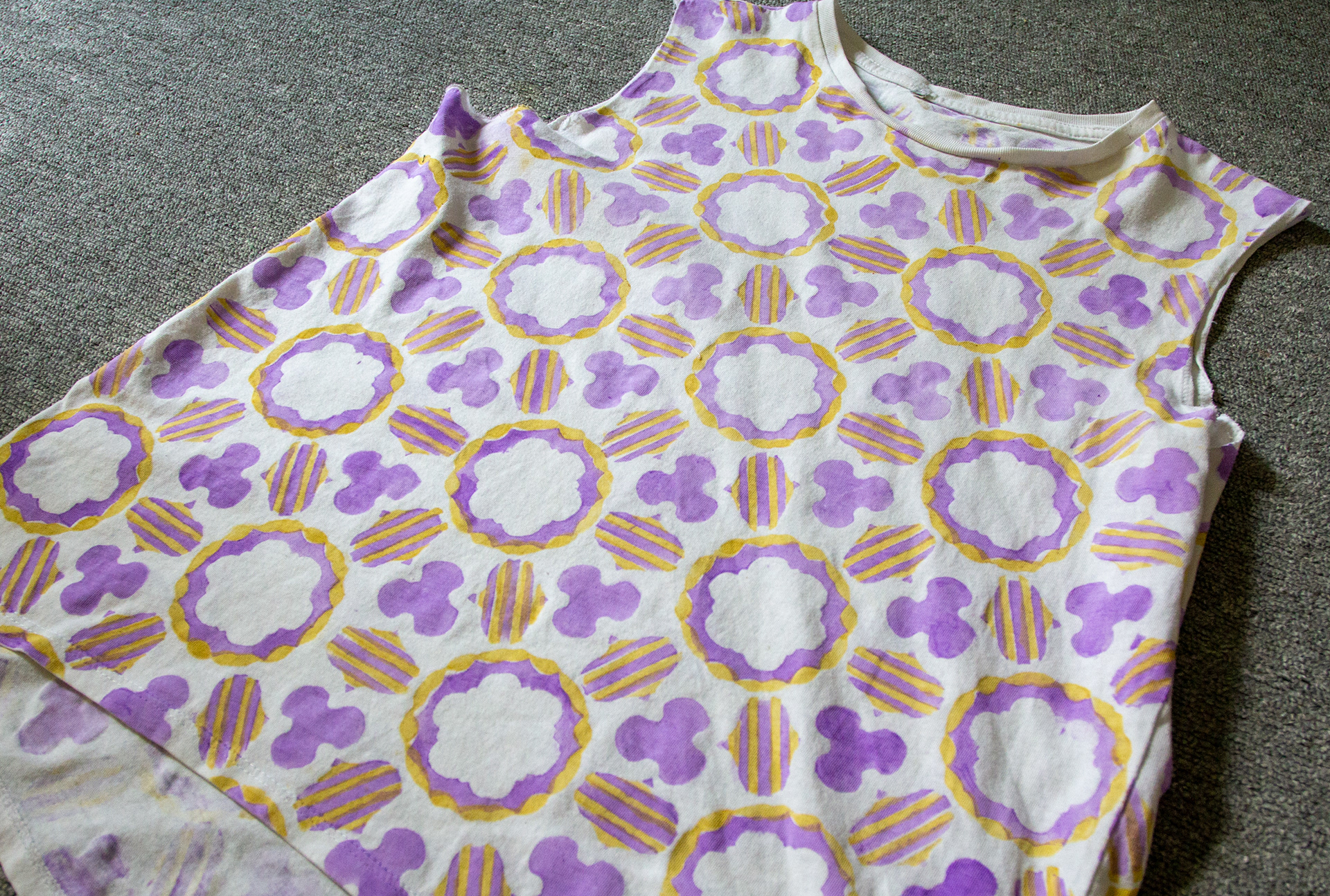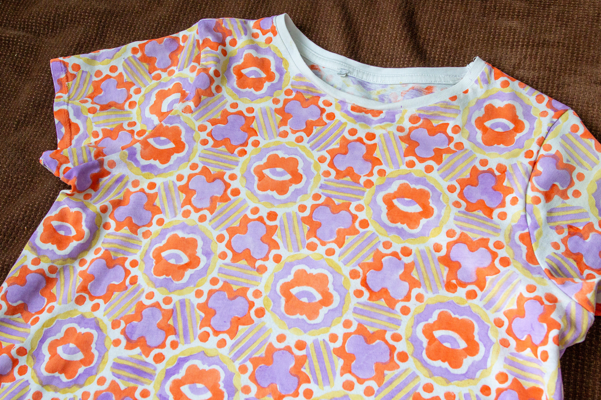 This pattern was inspired by psychedelic hexagon motifs. The aim of the project was to experiment with printing at home using fabric paints and stencils. The stencils were made from yupo paper, which is typically used with alcohol inks. The T-shirt was bought second-hand from a thrift store. To make printing easier, the sleeves were unstitched and later sewn back with a serger.