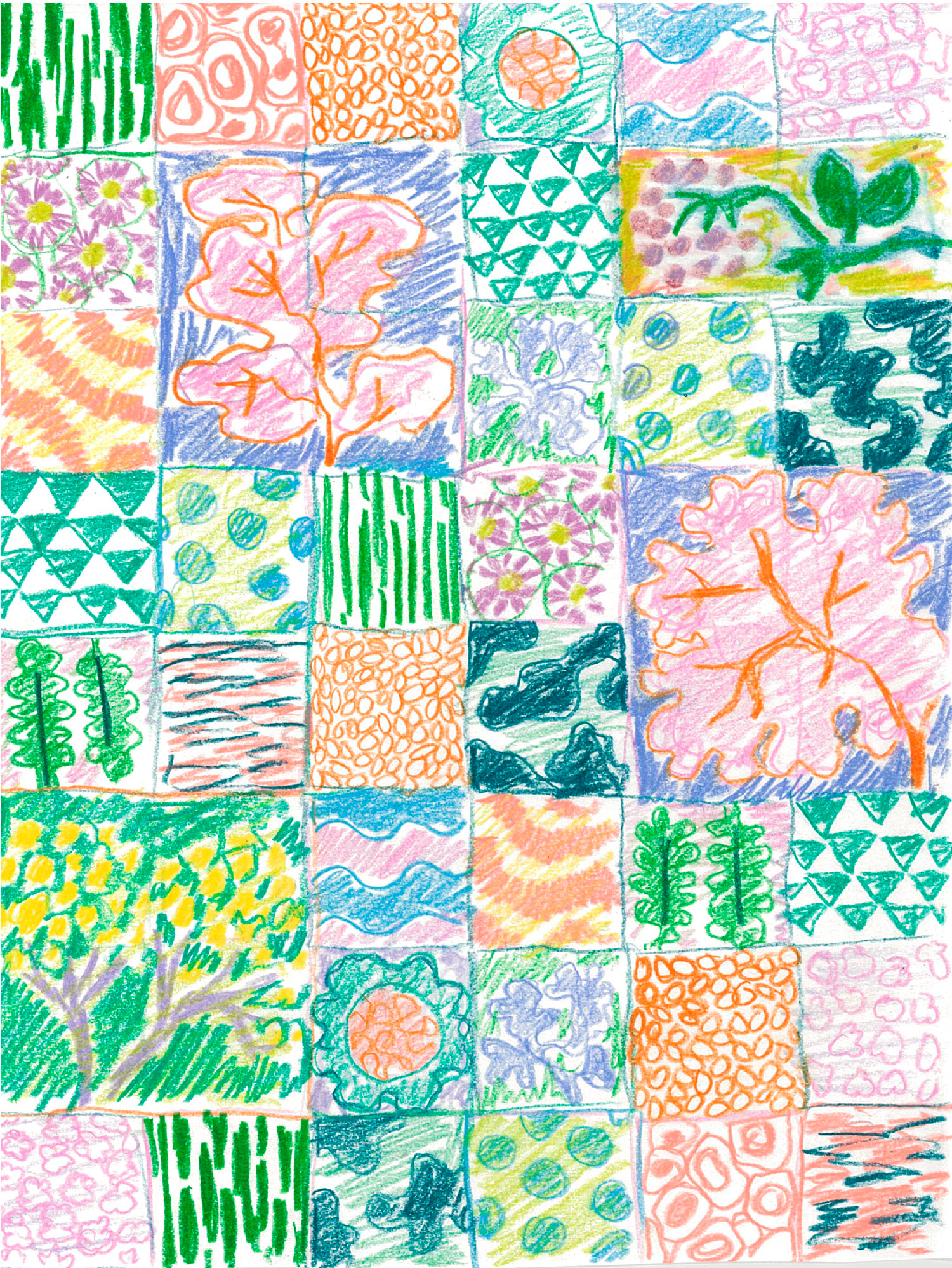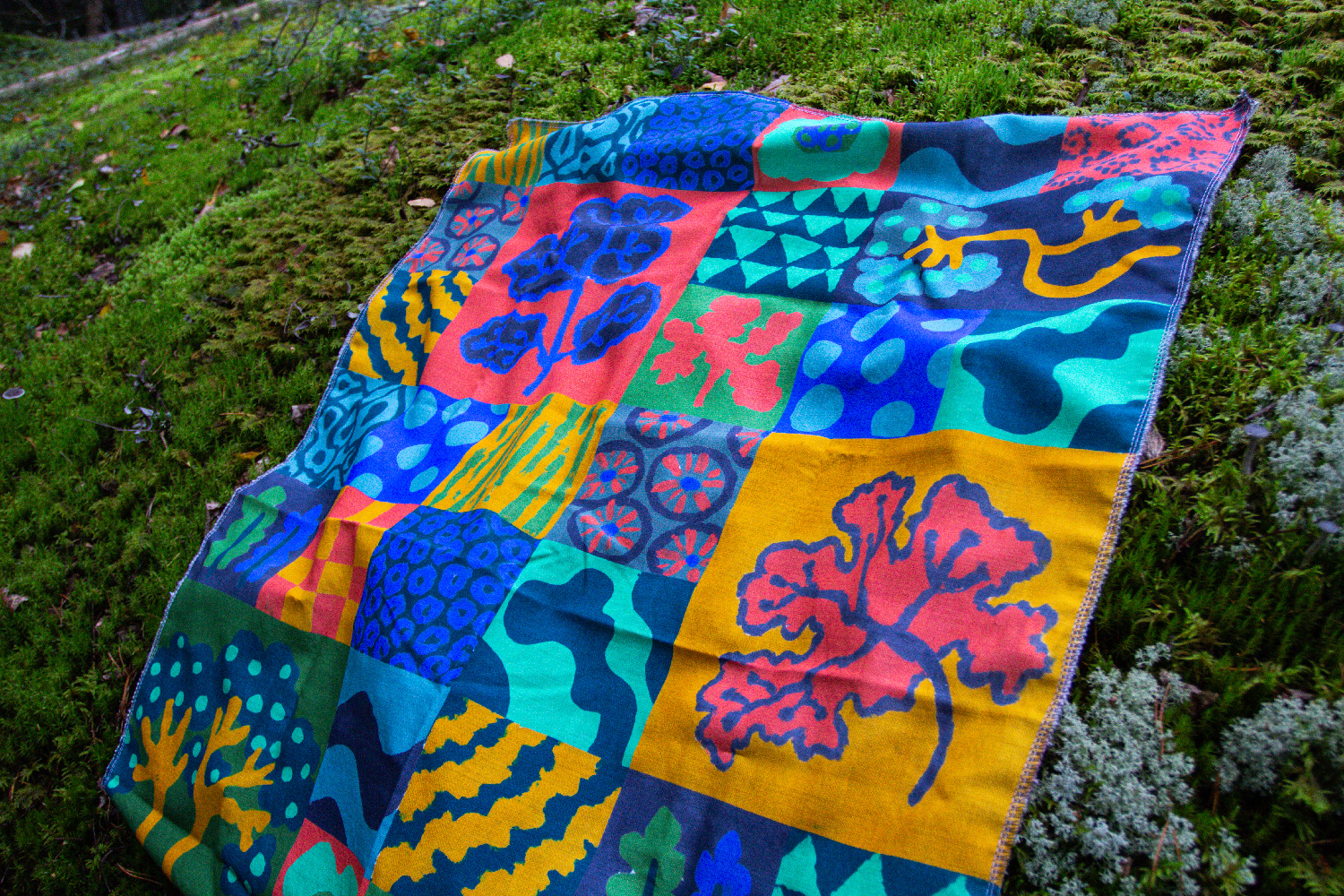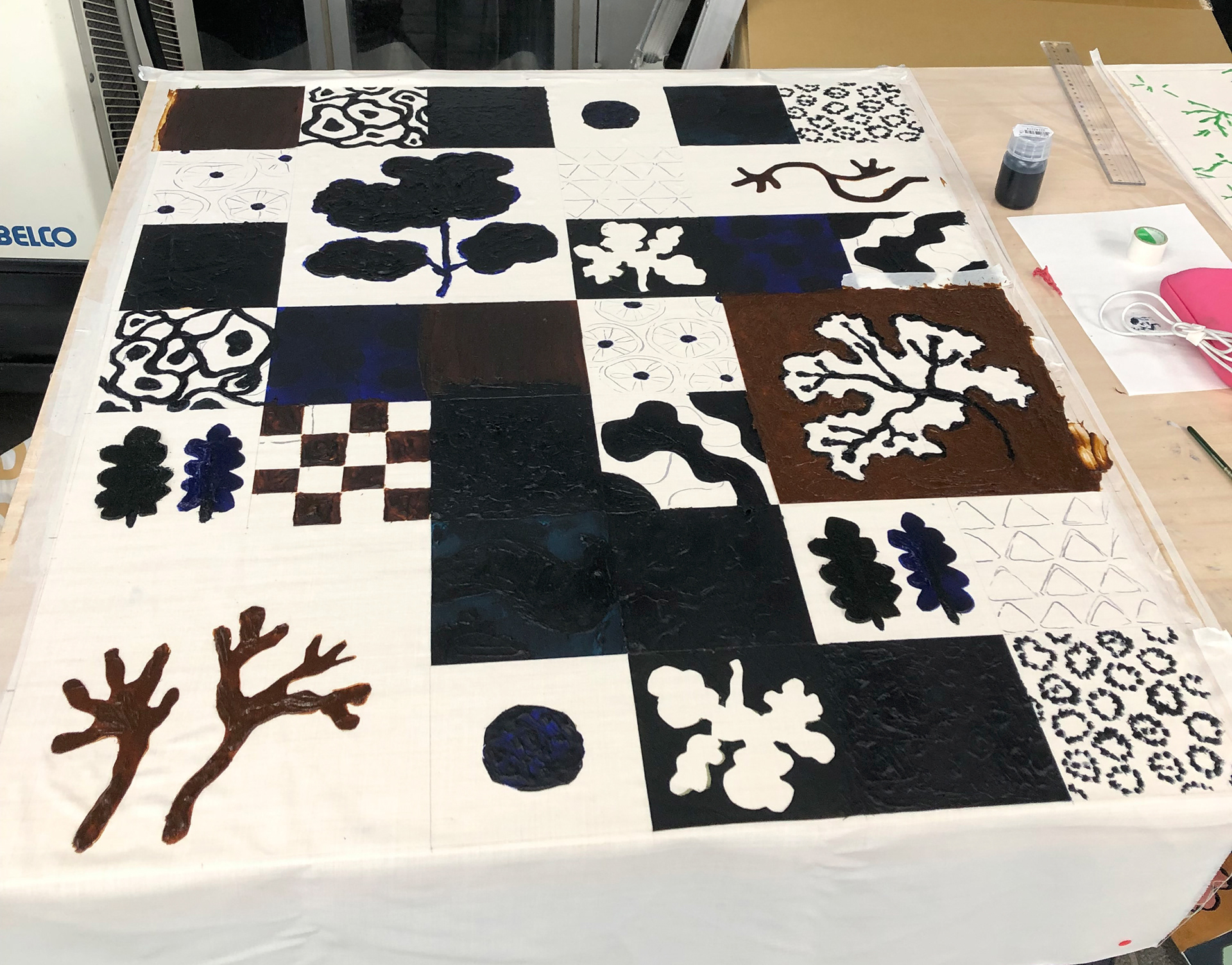 A fabric I designed and hand-dyed during a dyeing course at Joshibi University in Japan. The design is inspired by classic memory games. It was created with a traditional Japanese rice paste technique, in which pigments are mixed directly into the paste. Some elements were painted freely by hand, while others were made with stencils.