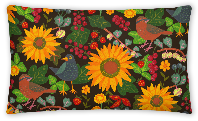 My sister bought an allotment garden with a cottage some years ago. The garden has become a summer hangout for friends and family, where everyone gathers to celebrate summer festivities and enjoy the fruits and vegetables grown on site. I had the honor of helping decorate the cottage, and I designed a garden-themed wallpaper for the hallway. I also created matching pillows for the cottage using the same pattern. Puutarhavieraat means "garden visitors" in Finnish.