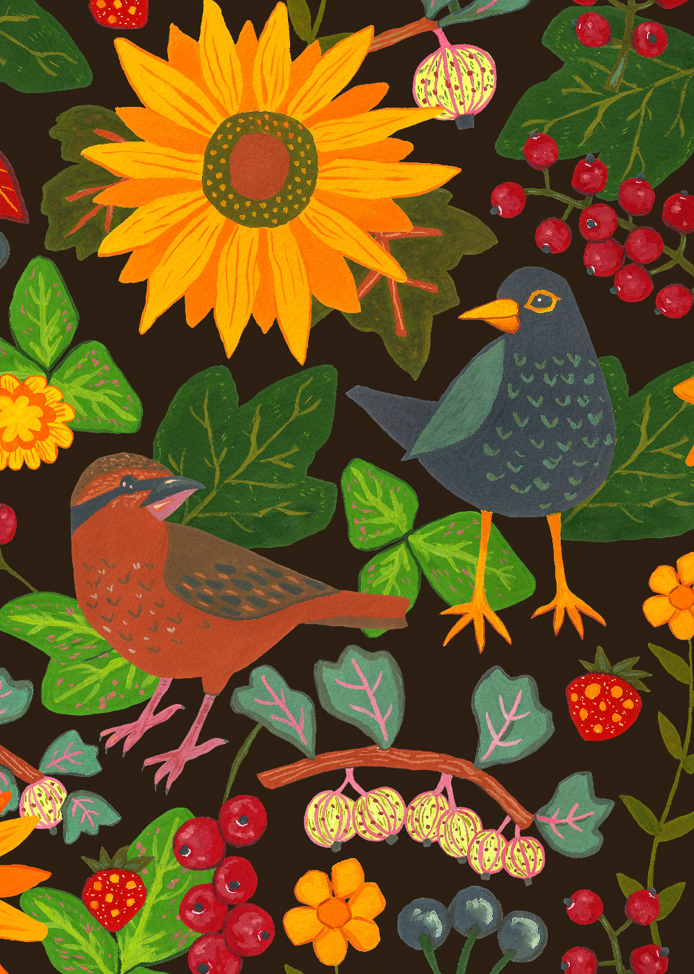 The elements of the pattern were painted by hand with gouache and digitally combined into a pattern.